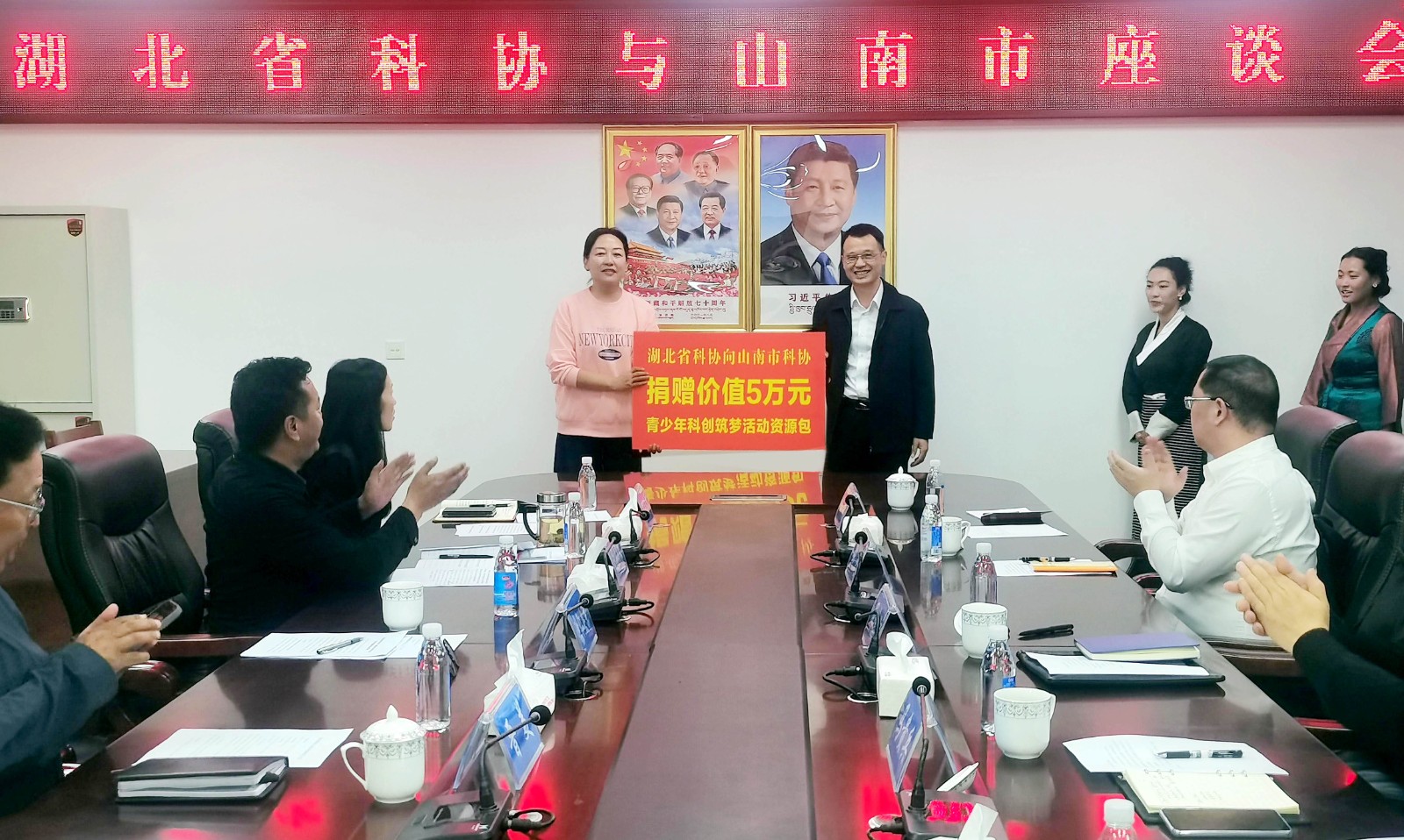 在山南市,周德文一行先后到山南市東輝中學(xué)青少年科技館、第二實驗幼兒園科普示范基地和湖北在藏高新技術(shù)企業(yè)調(diào)研,到山南市科協(xié)看望工作人員并召開座談會。周德文指出,做好新時代對口援藏工作,是貫徹落實黨中央關(guān)于西藏工作的重大政治任務(wù)。長期以來,湖北省科協(xié)認(rèn)真落實省委、省政府援藏工作要求,用心用情、盡心盡力做好援藏工作。此次調(diào)研看到山南市發(fā)生了巨大的變化,內(nèi)心感到非常的振奮。他表示,湖北省科協(xié)將一如既往支援山南,在政策支持、經(jīng)費保障、人才交流、技術(shù)合作、科普資源配送等方面給予支持,助力山南經(jīng)濟(jì)社會發(fā)展。最后,周德文代表湖北省科協(xié)向山南市捐贈價值5萬元的青少年科技筑夢活動資源包。