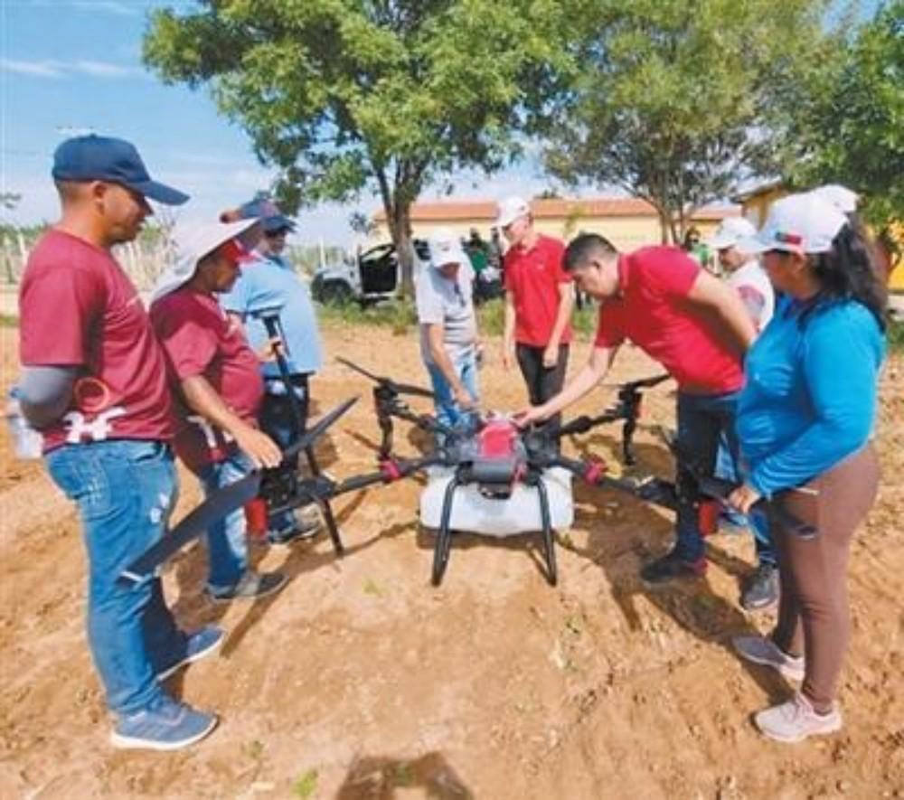 在巴西北里奧格蘭德州聯(lián)邦教育科技學(xué)院阿波迪校區(qū)農(nóng)場,巴西師生和農(nóng)戶學(xué)習(xí)操作中國生產(chǎn)的無人機。 迪奧任塞·諾夫雷加攝